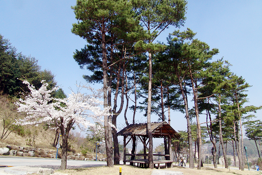 쉼터 주변의 기~인 소나무들